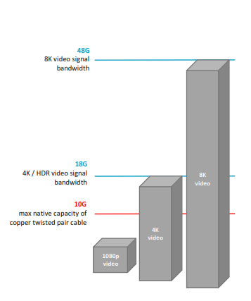 It handles the signals of today. 4K video requires up to 18G bandwidth, exceeding twisted pair cable’s max capacity of 10G. Fiber easily supports native 4K content.